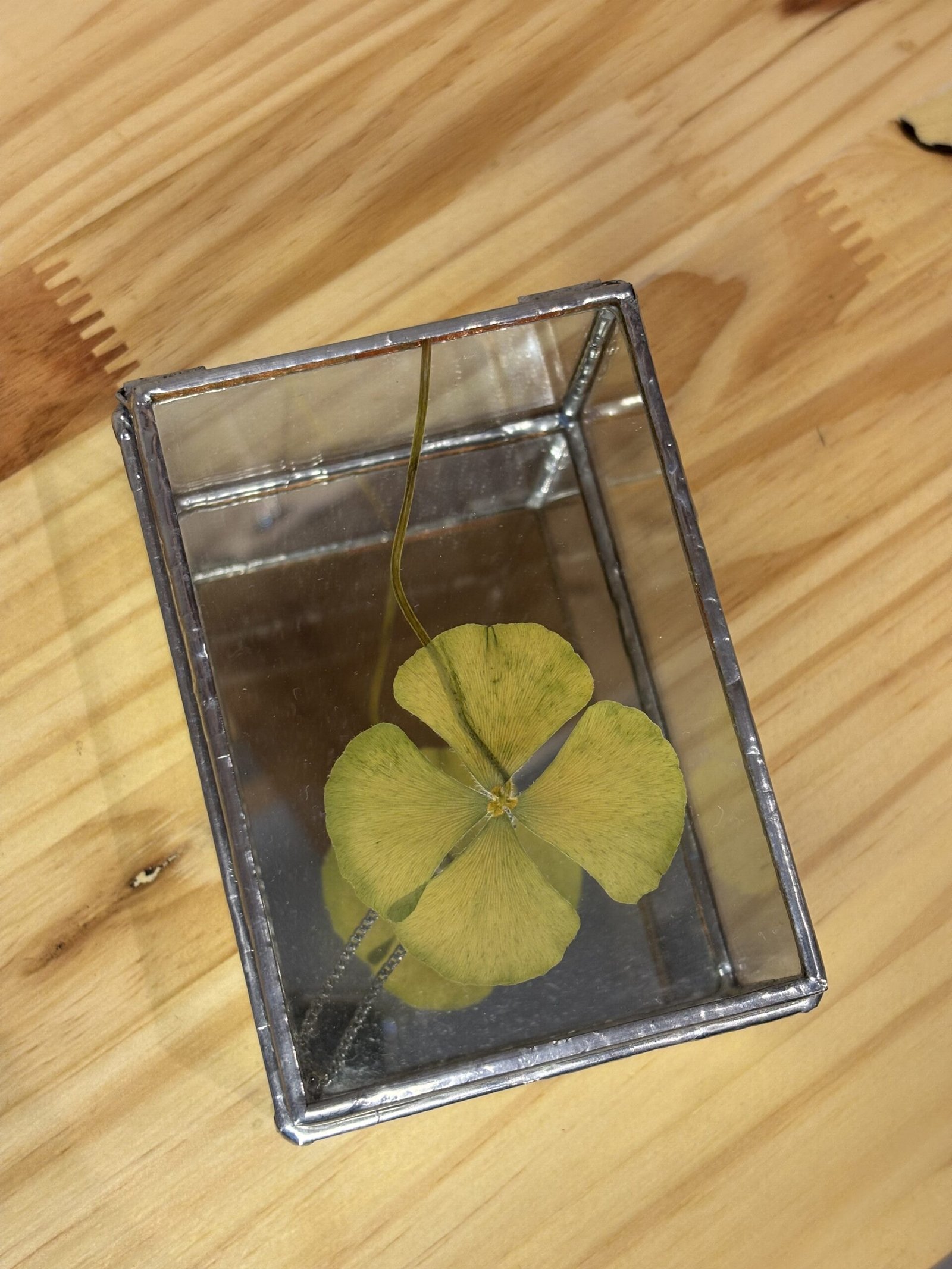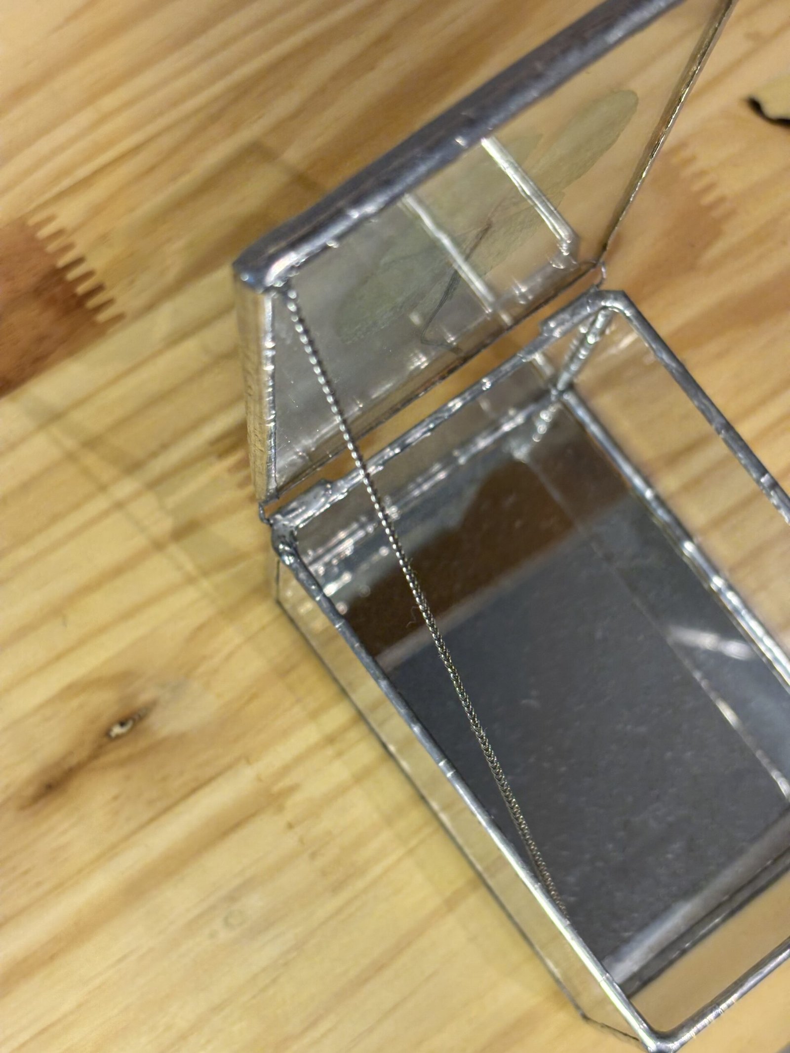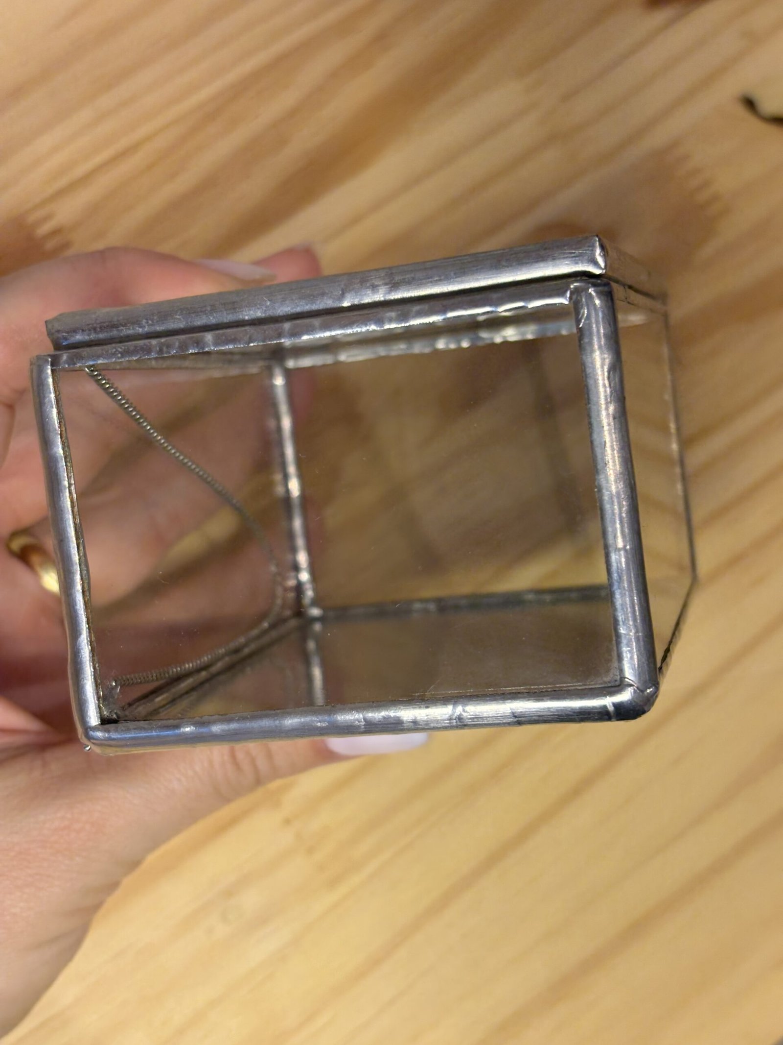 Material: caixinha em metal na cor prata com vidro transparente (feito pela Isa através de solda);